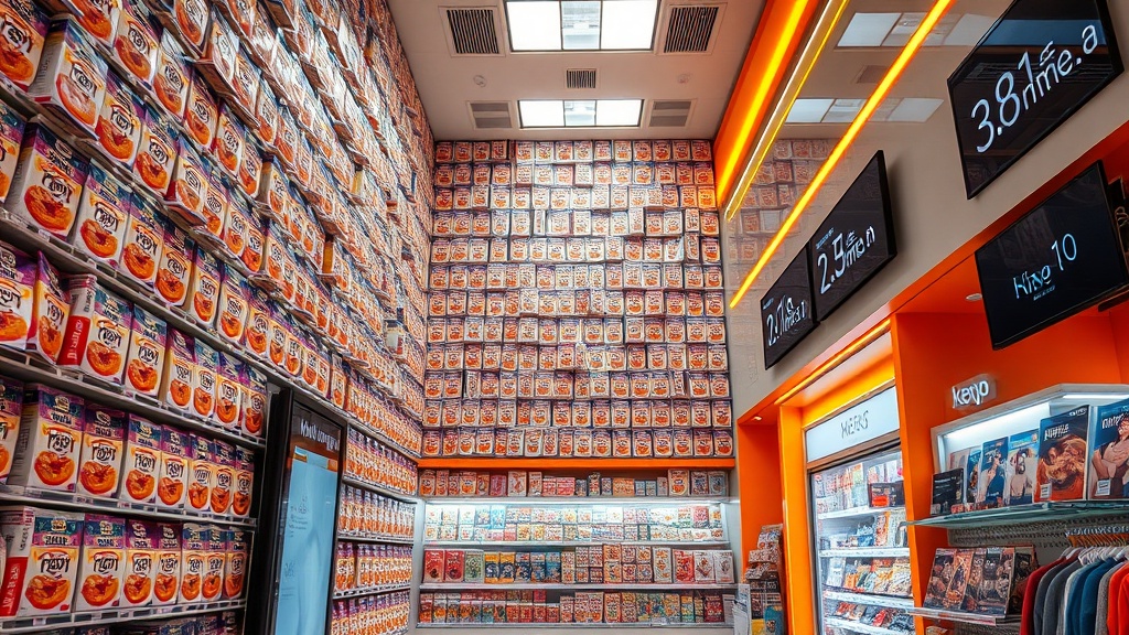 この店舗の最大の目玉は、2階に広がる「ラーメン特化フロア」です。階段を上がると目に飛び込んでくるのは、高さ2.8メートルもの巨大な壁面に、色とりどりの韓国ラーメンがぎっしりと敷き詰められた「ラーメン・アーカイブ・ウォール」。